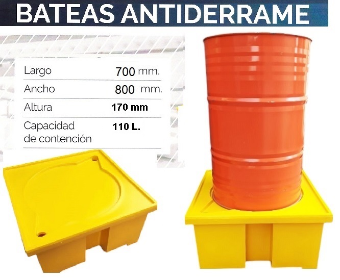 Batea anti derrame construida en polipropileno de alto impacto tratada bajo el sistema de rotomoldeado confiriendole al producto un alto performance tanto dinamico como de resistencia mecanica, aditivado para soportar la radiacion UV El diseño del mismo permite mover al conjunto mediante las uñas de un autoelevador