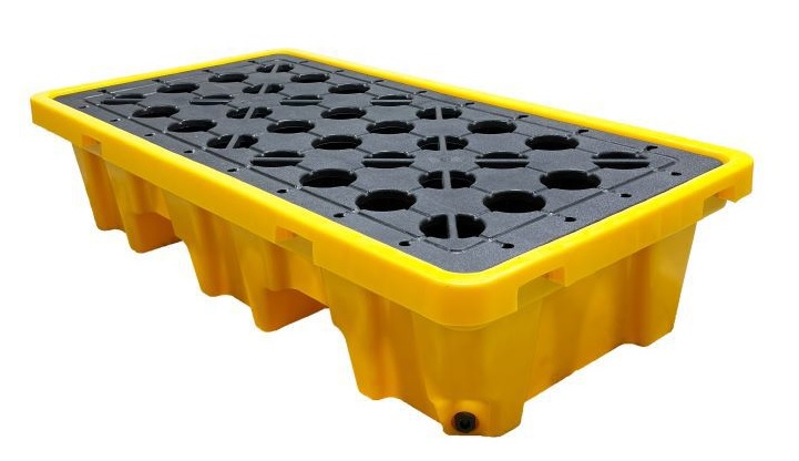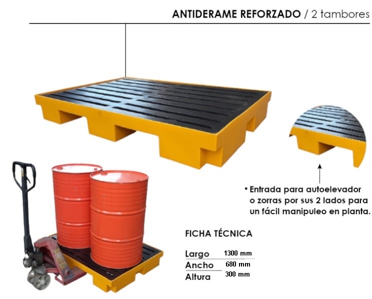 Nuestra batea antiderrames está diseñada para cumplir con las normas para el almacenamiento de 02 tambores de 200L o bien 32 bidones de 20L Cuenta con una serie de ventajas: Su rejilla es extraíble facilitando su vaciado o limpieza Las múltiples barras de refuerzo ubicadas en la superficie de contención distribuyen mejor el peso de la carga evitando roturas El diseño de la misma hace que el líquido derramado sea redireccionado hacia su parte interior La batea no cuenta con válvula de descarga, ya que está podría quedar abierta o bien fallar; asegurando así la estanqueidad total Con este requisito estas bateas INDUMOV cumplen con las normas internacionales al respecto Su diseño embonable reduce el espacio y costo de transporte Dispone de entradas para las uñas de un altoelevador para facilitan su traslado Presentacion en color amarillo medio (RAL 5012)