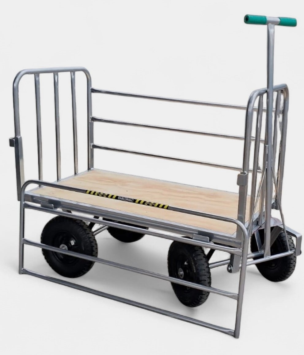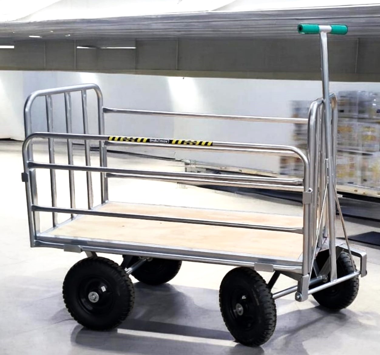 Zorra De Carga Con Lanza De Arrastre, de construcción pesada, con ruedas neumáticas súper reforzadas de diámetro 400 mm x 8″ con llantas de chapa estampada N°14 y rodamientos Con un robusto tren giratorio, ágil y maniobrable Indicada para cargas semipesadas El piso en chapa rayada antideslizante N°16 Altura de las barandas Frontales: 700 mm Acabado en esmalte sintético de color azul (RAL-5012)