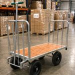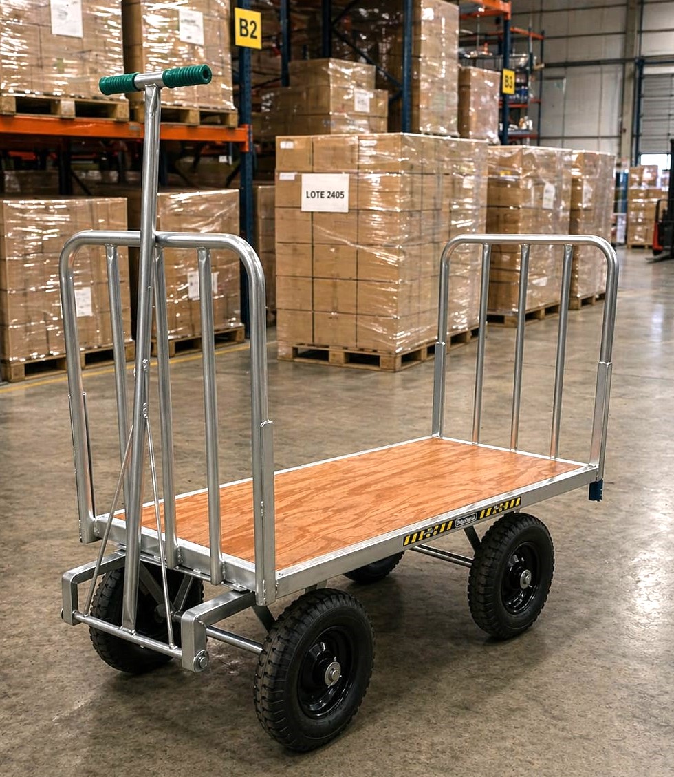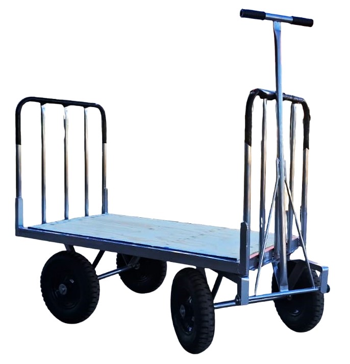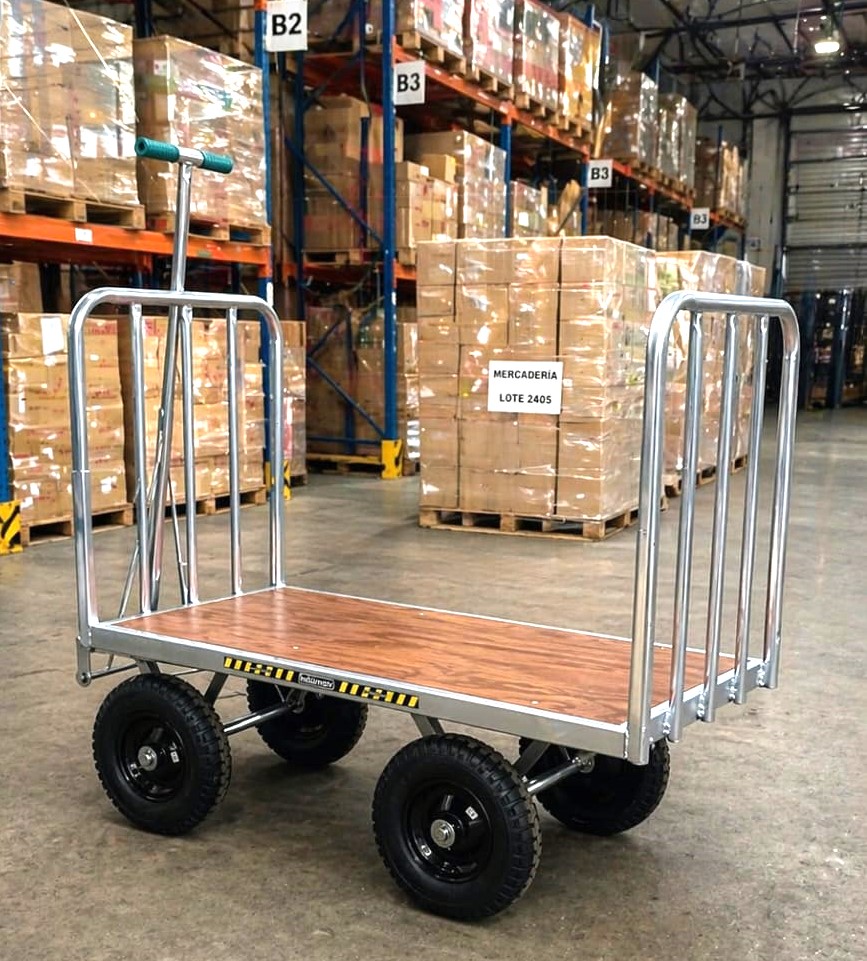 Zorra De Carga Con Lanza De Arrastre, de construcción pesada, con ruedas neumáticas súper reforzadas de diámetro 400 mm x 8″ con llantas de chapa estampada N°14 y rodamientos Con un robusto tren giratorio, ágil y maniobrable Indicada para cargas semipesadas El piso en chapa rayada antideslizante N°16 Altura de las barandas Frontales: 700 mm Acabado en esmalte sintético de color azul (RAL-5012)