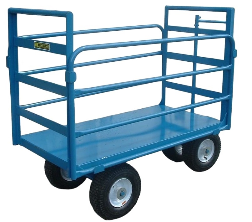 Zorra de carga con volantin direccional, ágil y maniobrable, con ruedas neumáticas 400 x 8″. Indicada para cargas pesadas El piso puede ser en chapa rayada N° 16 o bien multilaminado fenolico, de acuerdo a la aplicación de uso Con cuatro ruedas neumáticas de diámetro 400 mm, dos montadas sobre eje trasero y dos trabajadas en tándem conformando la horquilla del volantín Este modelo de zorra viene con sus dos barandas frontales fijas y sus dos barandas laterales, una de quitaipón IDEAL PARA EL ACARREO DE ROLLOS DE TELA DONDE SE FABRICÁ CON DOS BARANDAS FRONTALES Y EL FONDO LIBRE PARA EFECTUAR LA CARGA DE LOS ROLLOS Acabado en esmalte epoxi de color azul (RAL-5012)