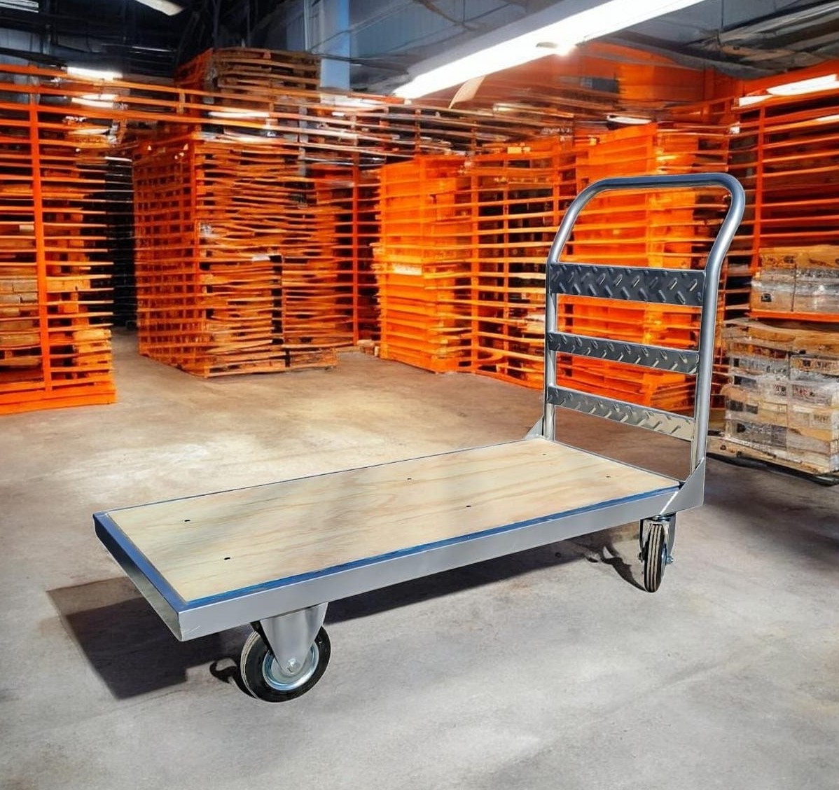 Esta zorra Manual de carga de construcción liviana preparada para una capacidad de carga de 400 Kg se fabrica con piso de chapa lisa N° 18 o bien, multilaminado fenolico, su bastidor perimetral en caño estructural de 50x20x1,6 le confiere una optima resistencia Posee una baranda de empuje construida en caño estructural de diámetro 11/4″x1.6 mm, cerrada con planchuelas de 2″x 1/8″